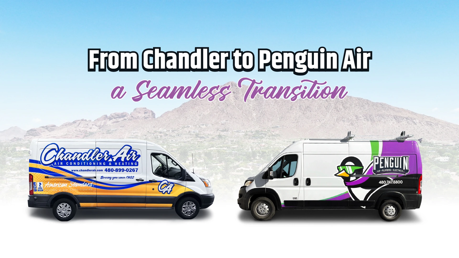 For now, you’ll continue to see Chandler Air vehicles and technicians when we arrive at your home. As we move through the transition, service will gradually shift to Penguin Air, Plumbing & Electrical vehicles over the next few months. No matter which logo you see, you can expect the same licensed professionals and the same 5-star service you trust.